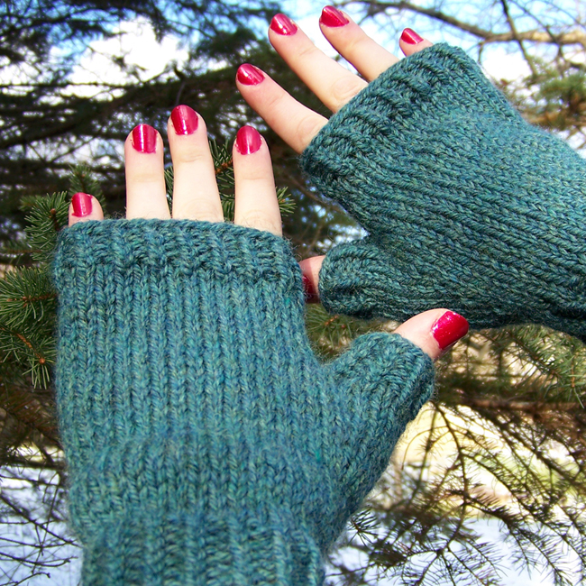 Pine Woods fingerless gloves are sturdy, practical and easy to knit. A shaped thumb gusset means that these gloves are made to fit the hand naturally and comfortably, while the twisted rib cuffs keep you cozy and the gloves securely in place. While my sample is knit in a rustic spruce green wool (Patons Classic Wool in Jade Heather), these gloves would look fantastic in your favorite tonal or neon colors as well.