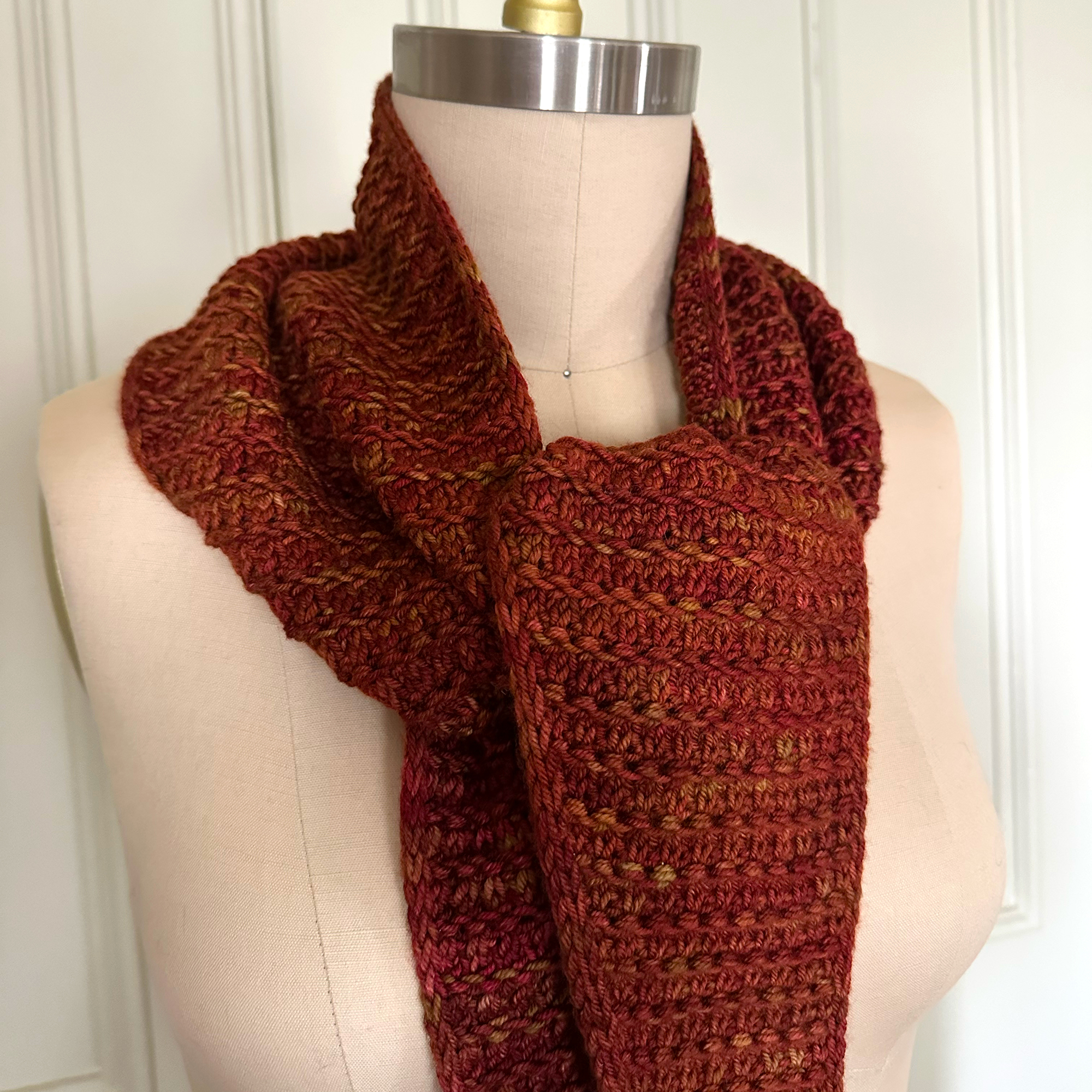 For my sample scarf, I selected a long-time resident of my stash, Madelinetosh Tosh Vintage, in a lovely autumn-inspired colorway called Crumble which, …ahem…is unfortunately discontinued! No worries, though. MadTosh has several lovely alternatives if you are going for a fall vibe colorway. Be sure to check out either Auburn Afternoon or Saffron. Both will give you instant fall flair!