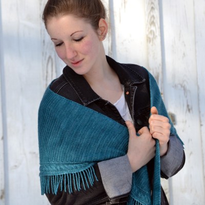 Named as an homage to spring, the Rainfall Shawlette is worked sideways and features an integral fringed border created from hundreds of tendrils, reminiscent of streaming rain on windowpanes. A rope cable border mimics the twist of each tiny tendril, while the body portion is simple garter stitch for a relaxing knit.